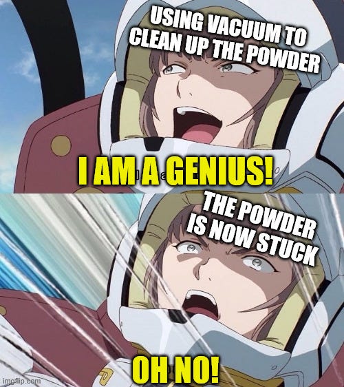 It is everywhere. Yes, I am using simple present here, because the fucking powder is now EVERYWHERE. Every last nook and cranny is covered in dark dust that refuses to leave. My first thought when seeing this was “I should have used a wet towel and just wiped it” but alas, it was too late. I have cleaned the dust collector, the filter and as much of the inner workings as I could, but I will never get it out of there again. So until the day this vacuum dies I will enjoy the smell of old cocoa mixed with dust whenever I need to clean something.
