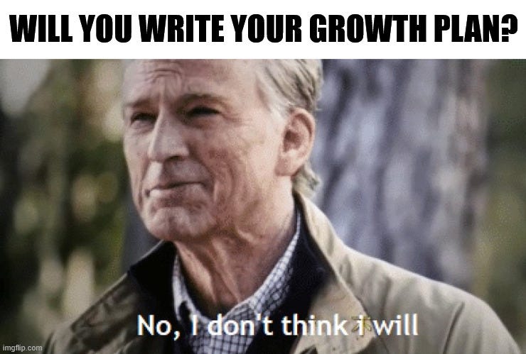 At a first glance a growth plan is similar to a Career Development Plan - a list of steps and milestones to accelerate your professional career. And that can be true, but then you are missing out on a lot of learning opportunities that will help you later (as I’ve touched before in this article).