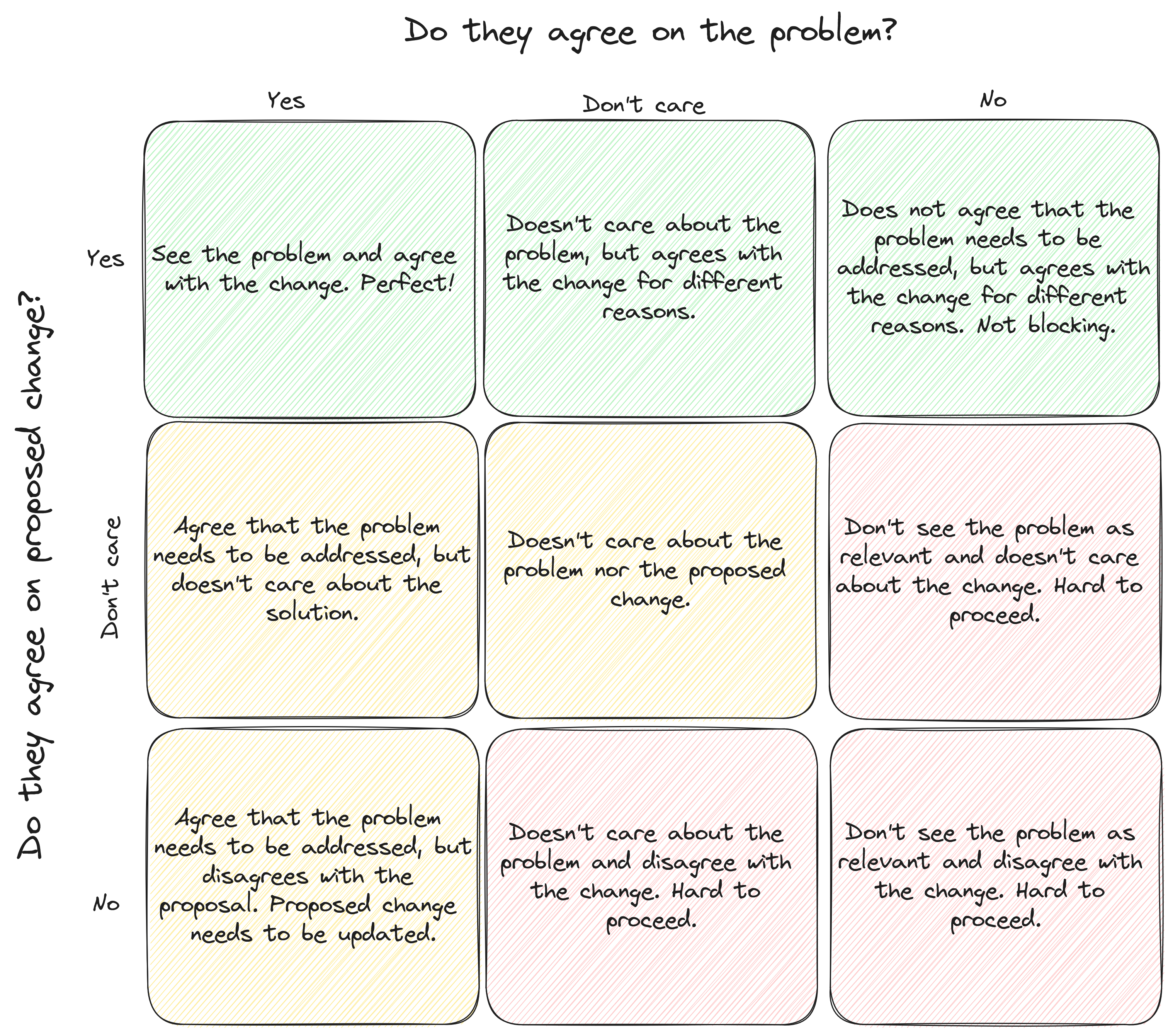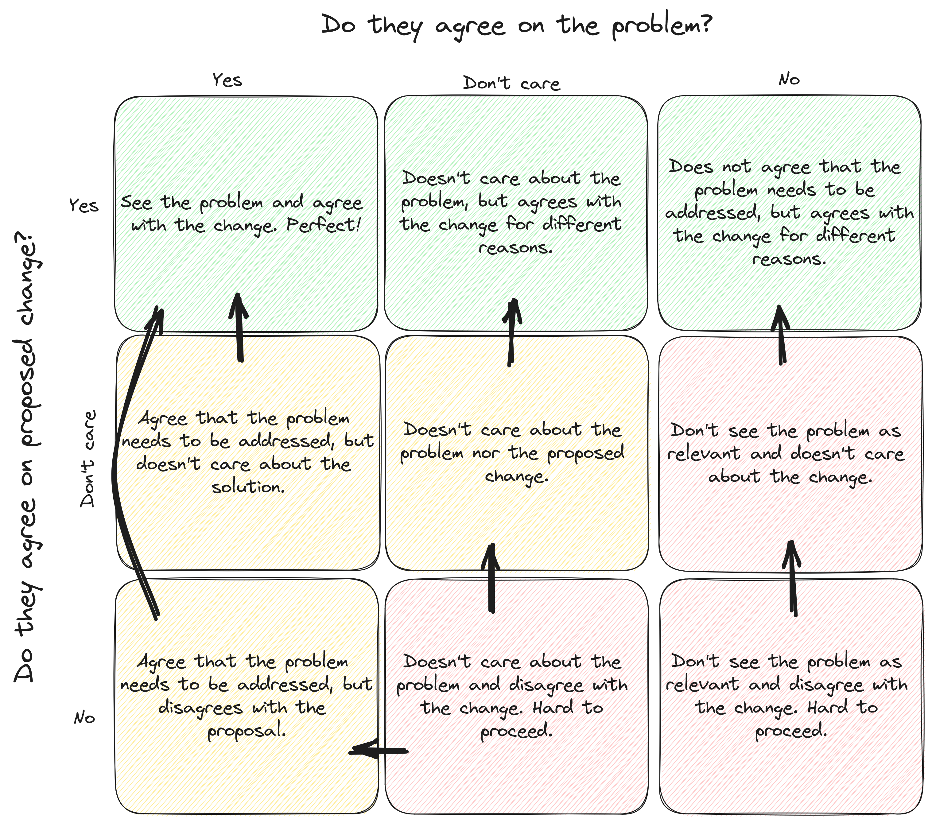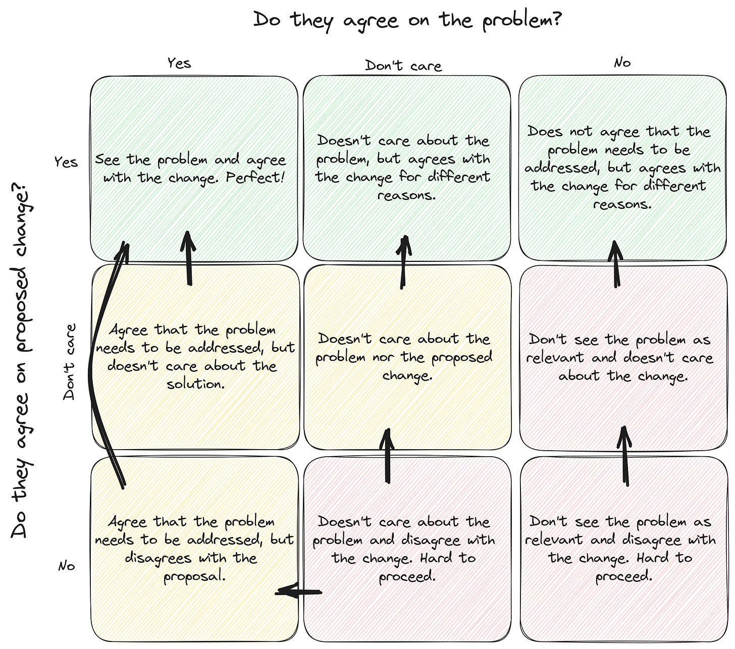 This looks different. And it helped me understand why our proposal wasn’t approved. Of the three stakeholders one understood the problem and was indifferent to the change, one did not really see the problem as concerning but agreed to the change and one did neither care about the problem nor the proposal. The last one later turned into a problem.