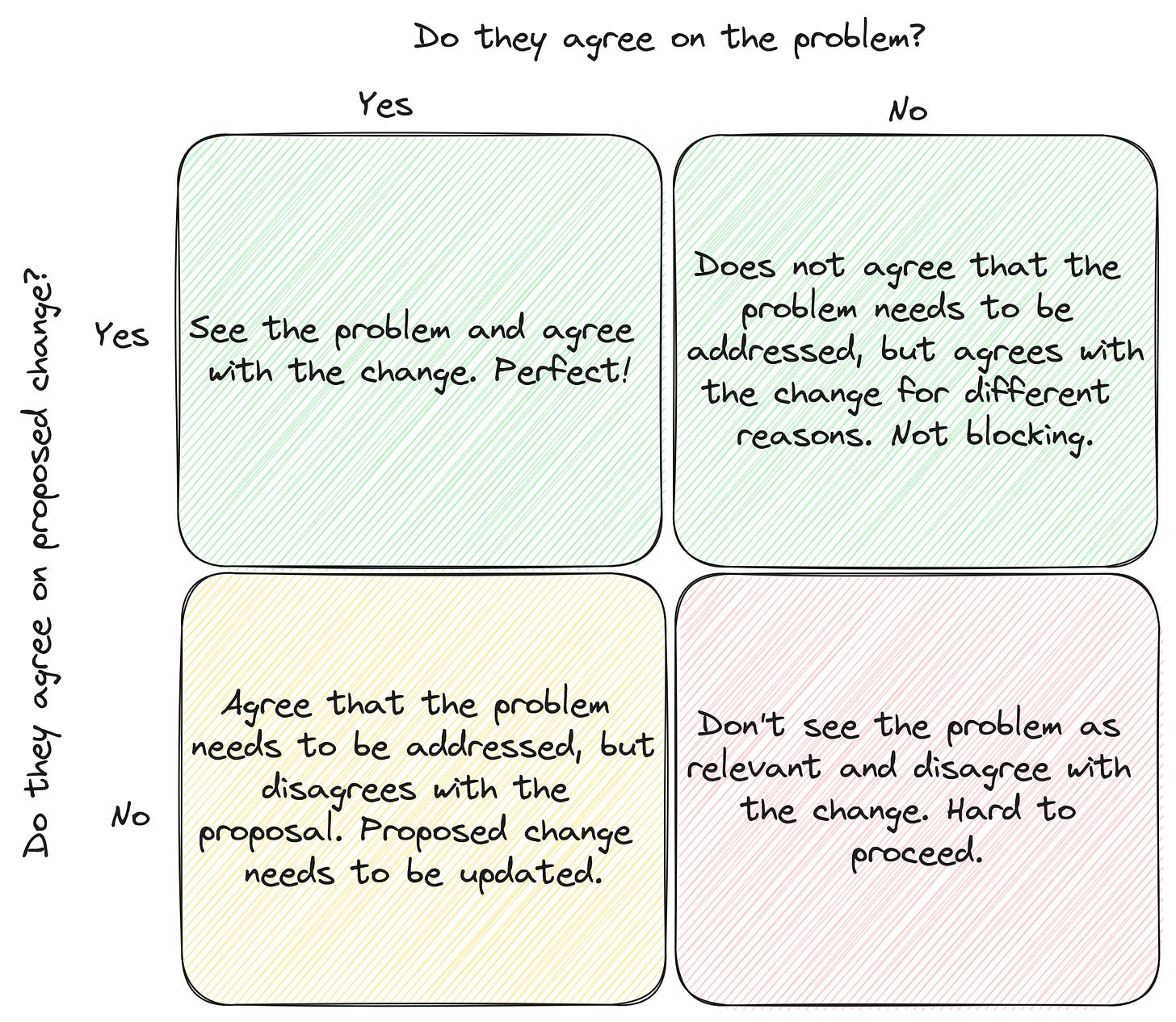 If they disagree with your proposal, it could be that they feel your changes don’t address the actual problem. Maybe they actually agree with the change itself, but don’t see the timeline as realistic. Same thing if they disagree with the problem statement - Perhaps they know something that you are missing, but they assume you to know. There can be dozens of good reasons to not agree with you. Try getting their feedback for what the issue is.